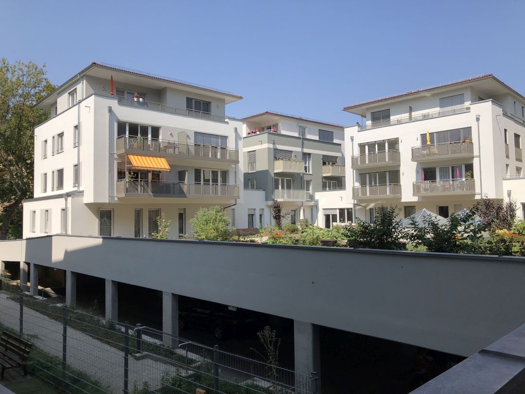 Im nordwestlichen Bereich der aufgelockerten Bebauung wurden drei Vollgeschosse sowie ein Staffelgeschoss realisiert. Auf der Decke des Garagengeschosses entstand ein begrünter Innenhof mit Spielplatz, Wegen und Sitzbereichen, der den Bewohnern als ruhige Aufenthaltszone dient.